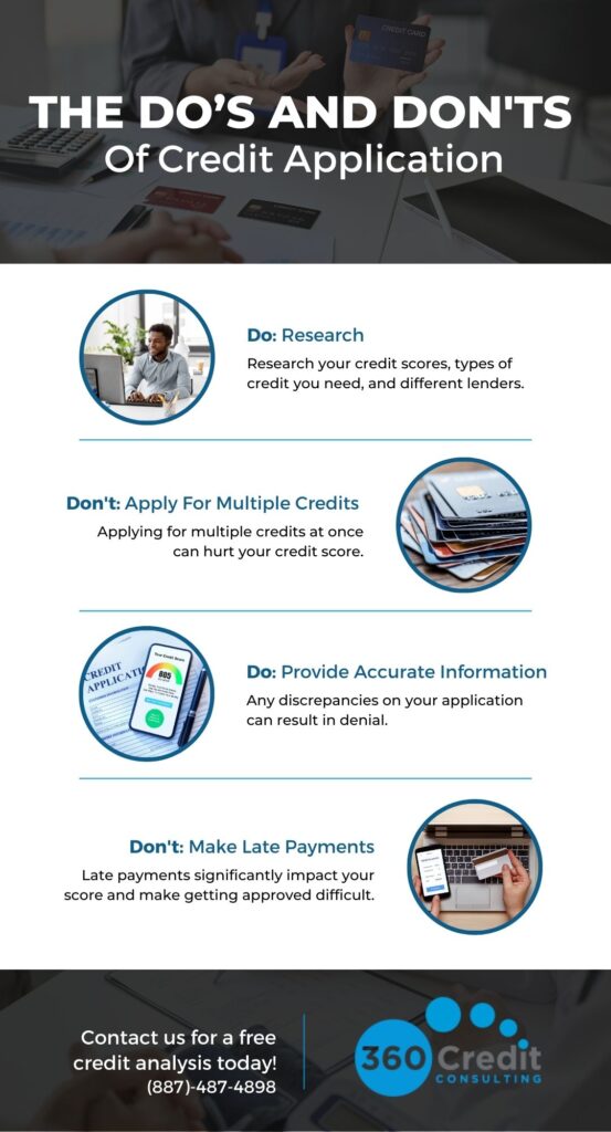Applying for credit can be a daunting task, but by following these dos and don’ts, you can increase your chances of approval. If you need further guidance or assistance, don’t hesitate to contact us at 360 Credit Consulting. We’re here to help you on your journey to financial stability.